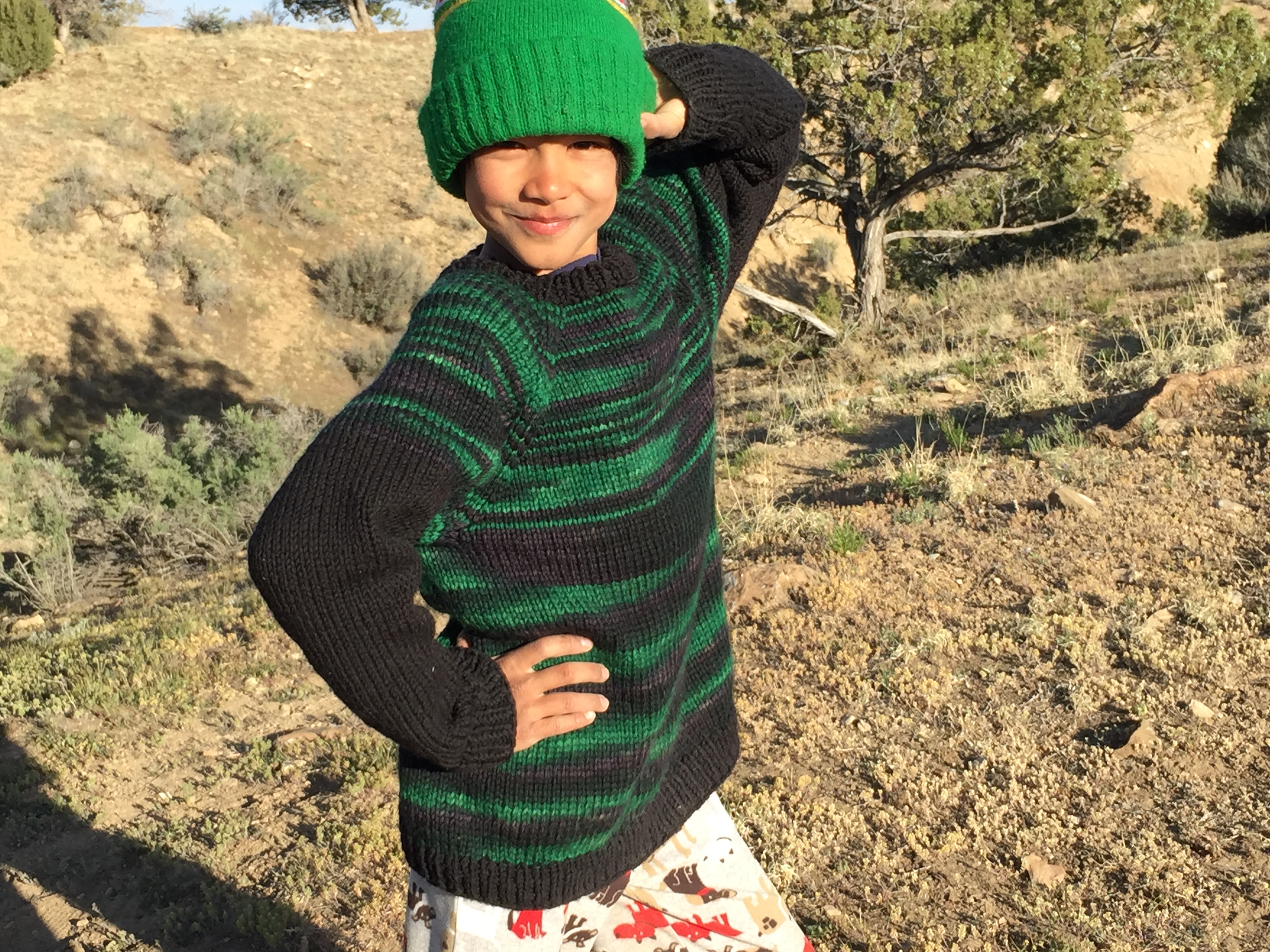 A few weeks before that the boy had asked me to make a sweater for him, which I was happy to do! Eric and I took a birthday trip to Crested Butte in March sans kids where I had purchased some hand dyed green and black yarn that I knew he would love. I made the rookie mistake of thinking I had enough yarn for a sweater, and ended up needing to buy some extra yarn to complete the sweater. This ended up being a good thing-I think the whole sweater in the variegated yarn would have been a mess. The yarn pooled a lot in the lower half of the sweater, but the boy said he liked it and loves his cozy oversized superwarm sweater.
