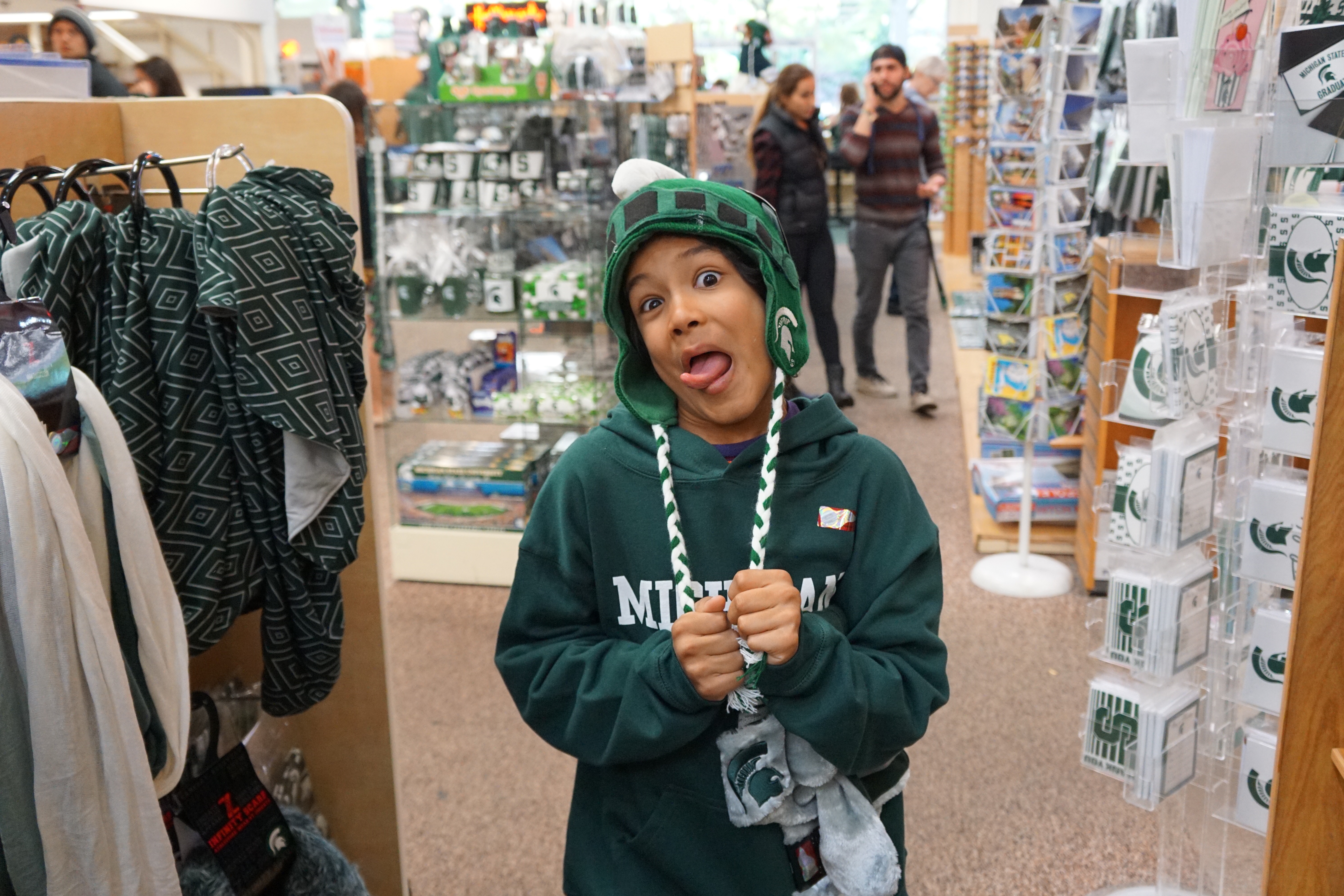 The next day we went to the MSU bookstore and did some real damage outfitting all of us in MSU gear. I drew the line at getting a flag for the house and said that one hat per person was MORE than enough. We STILL managed to come home with an extra T shirt that somehow skipped my notice.