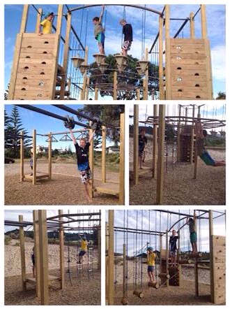 When we went to the black sand beach area, we found this amazing American ninja warrior play set. There was some logs you had to step on, some things you had to balance on and had to climb. And there was a twisty thing, monkey bars and stuff like that. It was this little loop which was fun and also a little dangerous too. Mom wasn’t going to let us play on it but dad said we could and I am so glad of it!! But we couldn’t go back in the morning. ππ