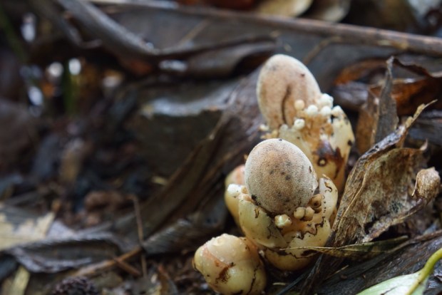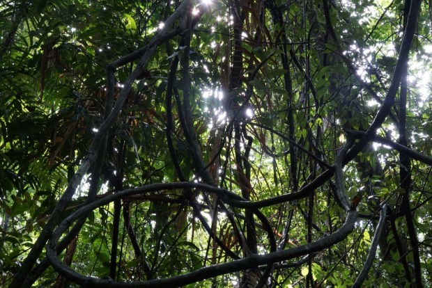 We took the first turn off and found an area with a guided Boardwalk tour and also a 2.7 km hike through the rainforest which the sign said was for “Adventurous people only.” Well, are we adventurous or not? Off we went into the muddy red trail. About 5 minutes into the trail, you are in deep rainforest. You hear loud cackling birds, small cheeps, song birds (one sounded like “pomp and circumstance”) and occasional scurry sounds. The forest floor is cool and shaded, with light just peeking through the upper canopy layer. There are no people around at all, and there were times I was pretty scared, especially when there would be a loud kee-rak cry just off to my left. The eerie thing is, because the animals all live in the canopy, you don’t see any of them, just hear them.