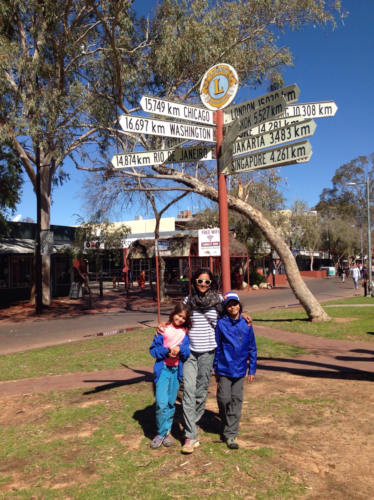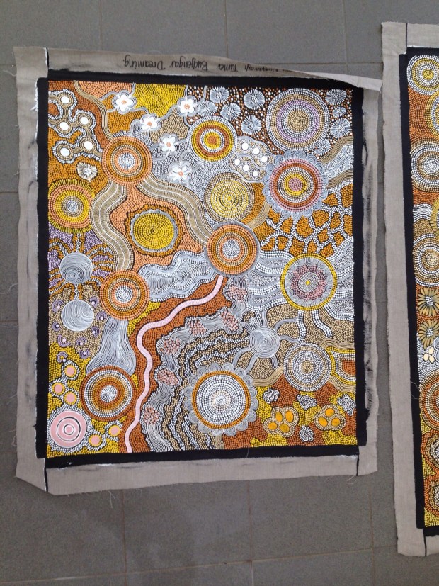 On this day we walked around the mall, finalized our car rental plans for the next day and then went to a wonderful Aboriginal art gallery which was marked by a focus on cooperation with the artists, so that they were fairly paid for their work. We spent a lot of time talking with the owners, Ric and Karl, about the art in their gallery, Yubu Napa, and how they approached the artists in a fair and respectful way and how many of the gallery owners in town would be dismissive of the artists or pay them a pittance or worse, in alcohol. We fell in love with a beautiful piece of art, titled “Budgerigar Dreaming” and bought it for our home. It represents how the indigenous people would search for waterholes in the land and the walkways between them. As it turned out, the artist is the one currently in residence at the Uluru gallery, and we were able to meet her later there, which was very cool.