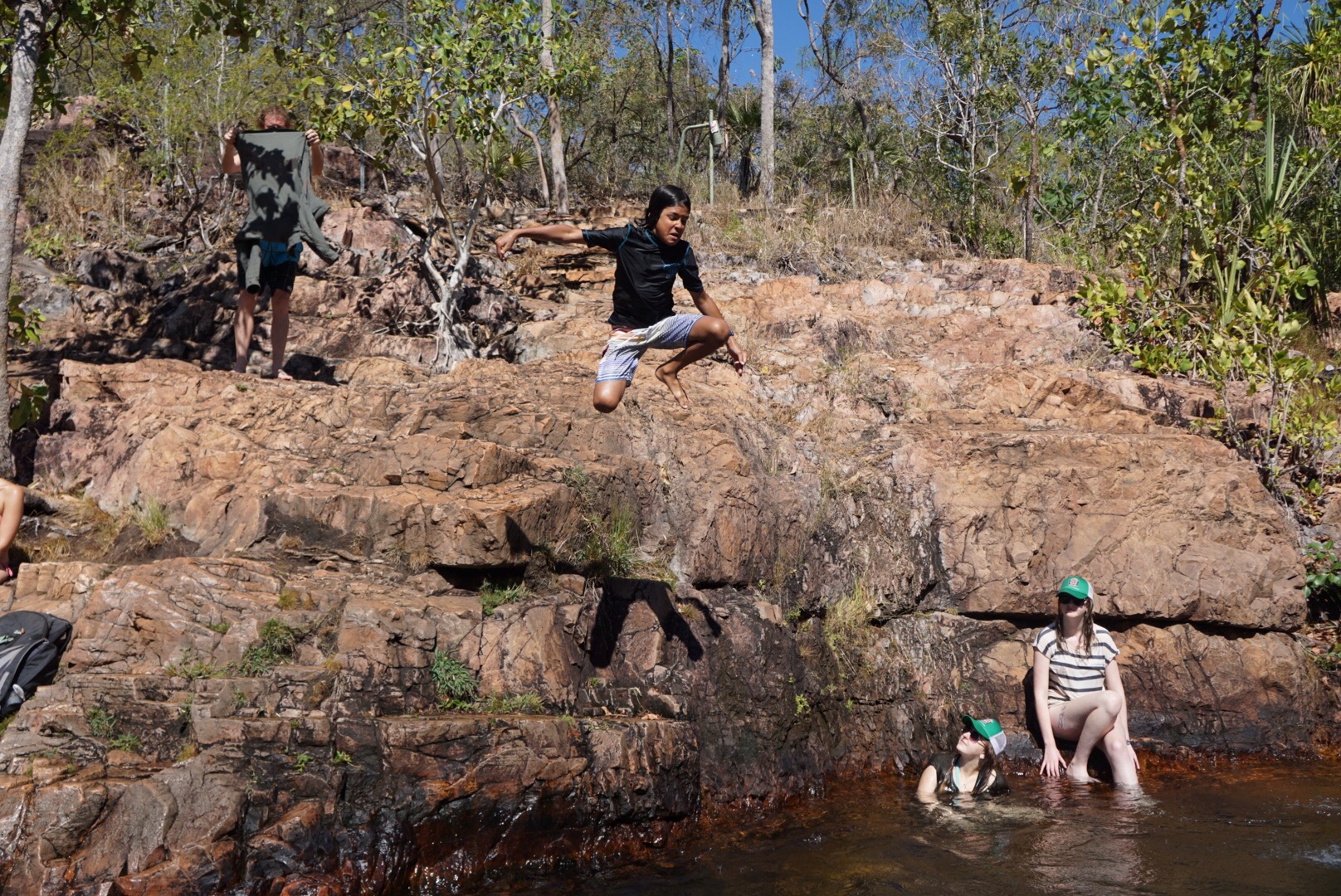 The other part of the trip was visiting the swimming holes, which were absolutely stunning. I’ve never gone somewhere where you jump into a natural pool surrounded by waterfalls that feed into it. Fun fact: it’s the dry season and hasn’t rained in months, but the waterfalls are fed because the stone surrounding them is a porous sandstone that soaks up water during the wet season and then releases it during the dry! The second stop was especially nice, where there was a 10+ meter deep pool that the kids could jump into, and they did, over and over.