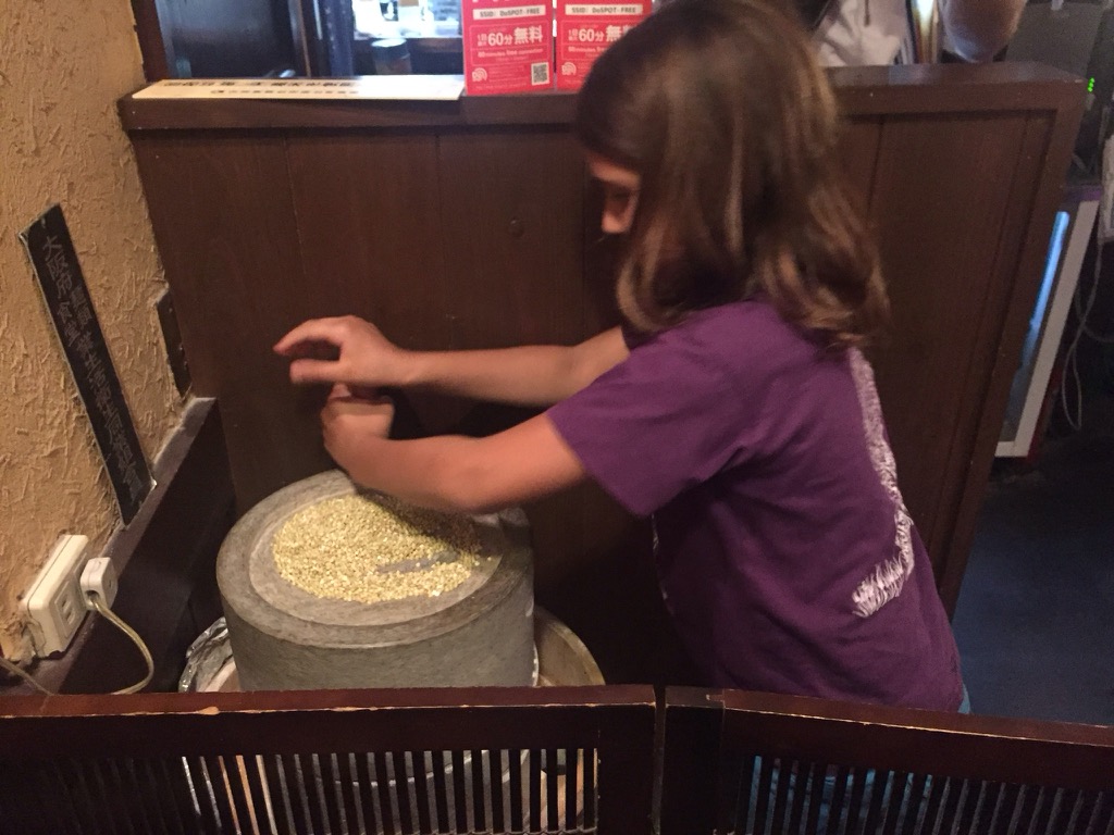We tried to find a place to hang out and have a drink and some appetizers, but couldn’t find anything where the kids were welcome to come in with us. After some more fruitless wandering we finally just went to a soba noodle restaurant where we were warmly welcomed by the cook. They grind all their own buckwheat to make the noodles in house, and the kids got to try their hand at traditional grinding. Man, I am going to miss the food here.