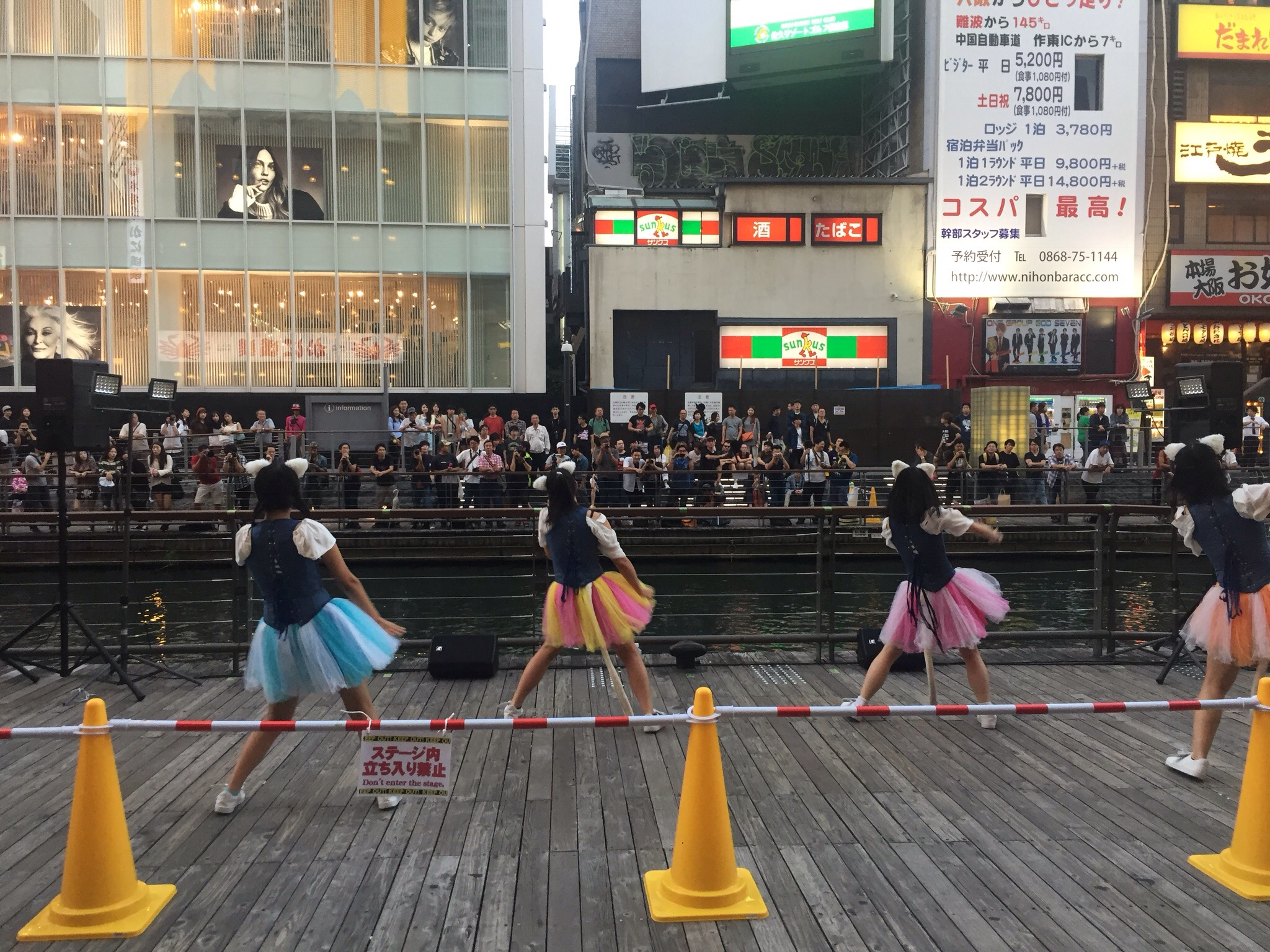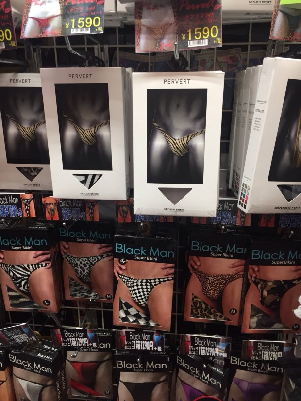 In a fun ironic twist, Eric doesn’t like heights and they make him quite vertiginous. Seriously. While the rest of us enjoyed the views of Osaka from up high, he went down to the cafe on the next level and stared at his Kindle, trying to ignore the fact that out the window was a long way down. Our next stop was the Dotonbori area of Osaka, which I liken to the Times Square of the area. Bright lights and big animatronic animals advertising restaurants, and lots of people. The only difference is that I think plenty of real Osakans head here all the time, unlike New Yorkers and Times Square. The most bizarre thing for me, however, was that there was a girl group performing at the riverwalk area – that in and of itself was fine, but across the river were grown men twirling towels around and cheering and actually weeping in joy at them. It was like the scene at an N*SYNC concert, only the performers were twenty year old girls and the screaming fans were middle aged men. There was also a huge store called Don Quixote, that sold all sorts of random weird things, including some…questionably named men’s underwear.