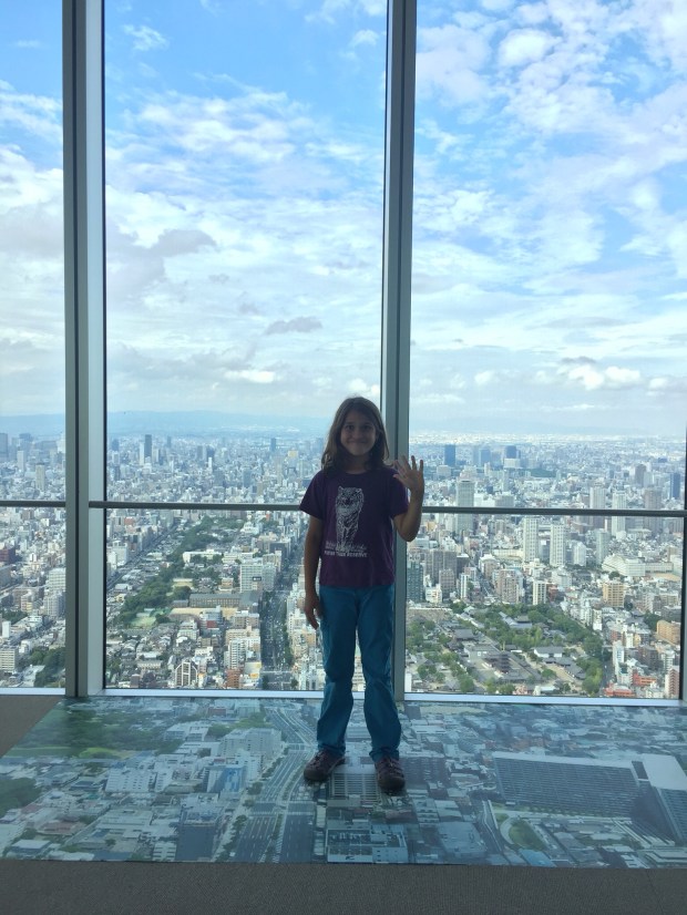 The initial plan for Monday had been to take the train to Nara, land of lovely parks and wild deer which frolic about and you can feed. In the morning, after having had coffee, the idea of taking a train to sightsee anywhere was not appealing. Add to that that the main draw in Nara is a large shrine and everyone just gave me a big stare when I mentioned it. Instead we went to the Harukas observatory, 300 meters up high. We had to go there to pick up our tickets for Universal Studios Japan (are you kidding? Of course I did! They have a Harry Potter World there!!)