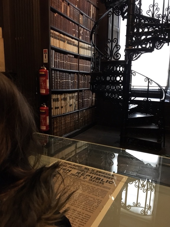 After the Book of Kells viewing, you walk through a narrow passage to enter the Long Room of the Old Library. Friends, this feels magical to walk into, as if you’ve stepped into a past time where bald pated scholars in robes would carefully examine the leather bound tomes held within. Two floors of wall to ceiling books and busts line the central pathway. A security guard gave the boy’s hat ears a friendly flick as we walked by, and we stopped to ask him if the books were still read. Indeed they are, by appointment only. A copy of the 1916 Proclamation of the Irish republic resides here as well.