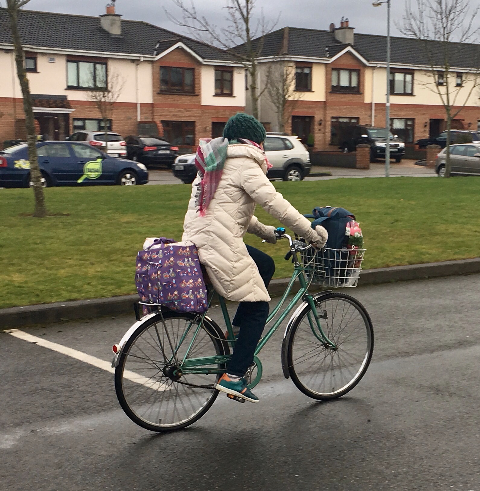And here I am on my bike, graciously loaned to me by our friend Alena. That’s about 20 pounds of groceries I’ve got loaded on, not atypical before we discovered grocery delivery service, thank goodness.