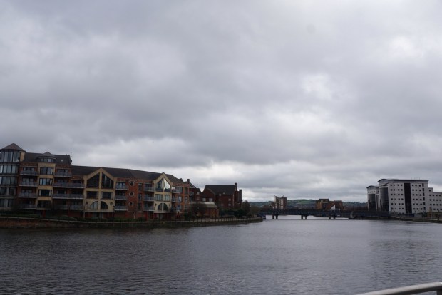 Belfast today, as seen from the banks of the Lagan. Sheep fields in the near distance of this compact city.
