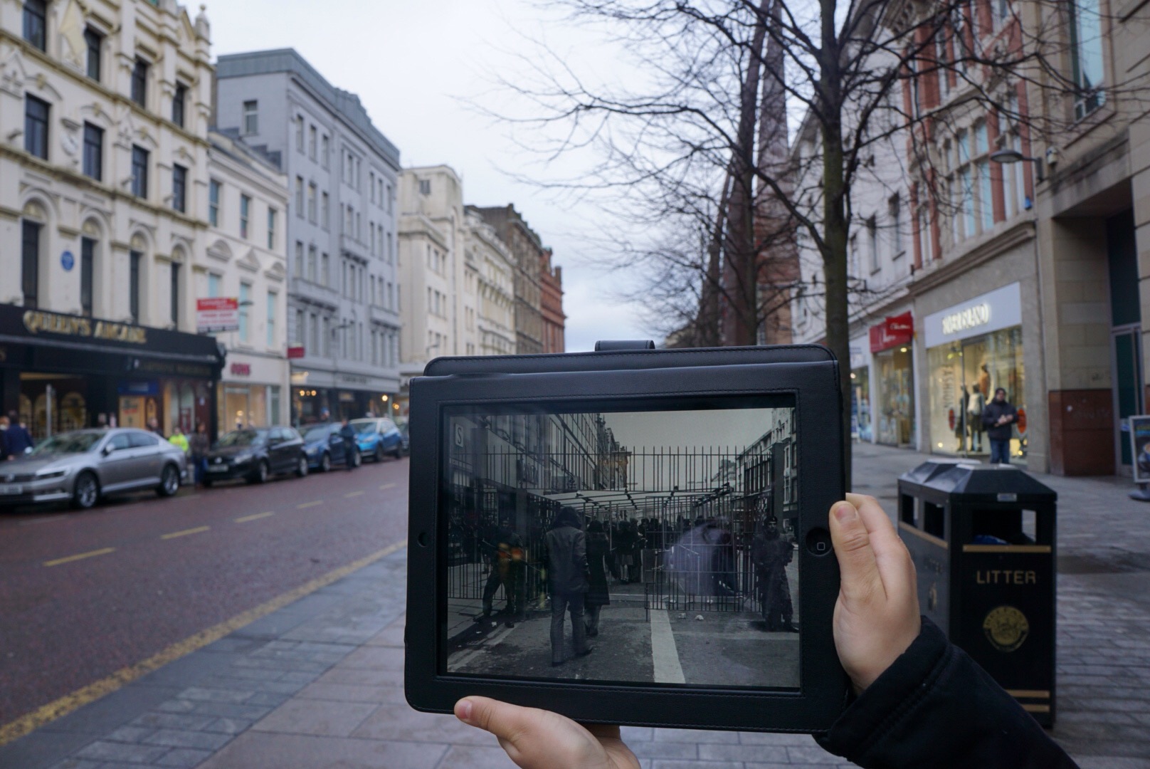 Main street, city center then and now. Barricaded checkpoints at the entry to search for weapons