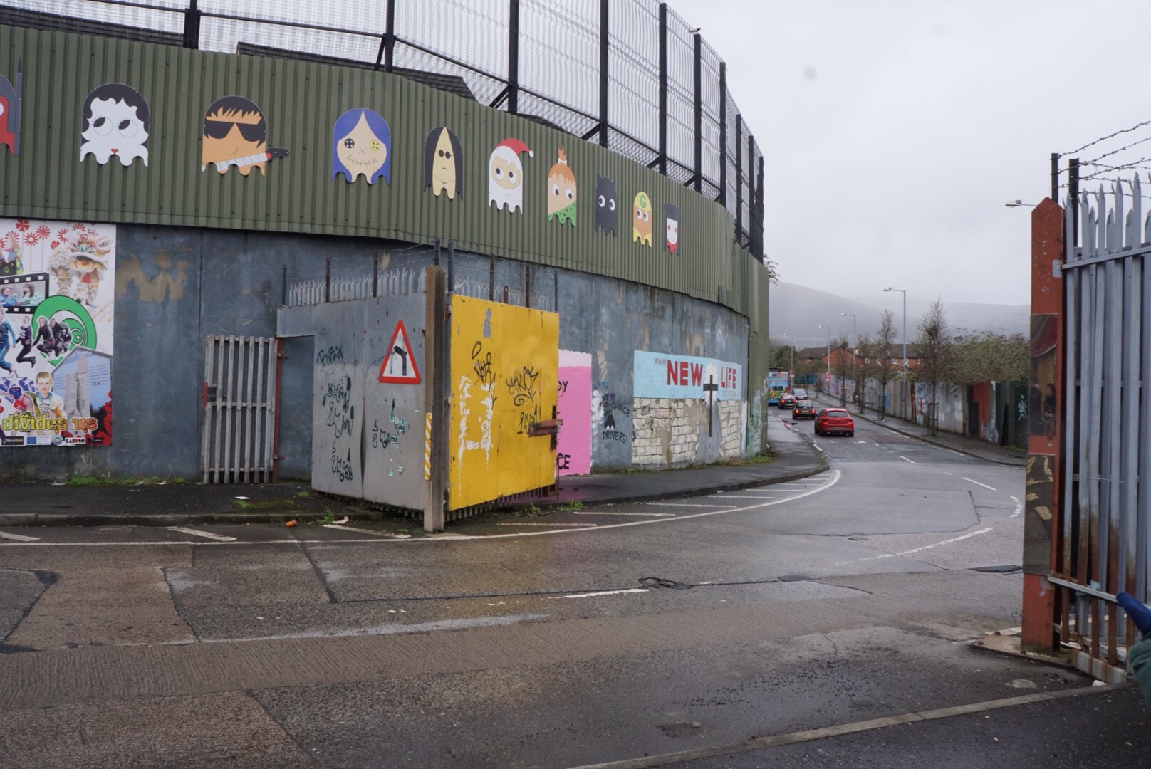 The peace wall as it stands today, separating Catholic from Protestant neighborhoods. Cartoonish artwork seems to try to “prettify” the harsh structure.