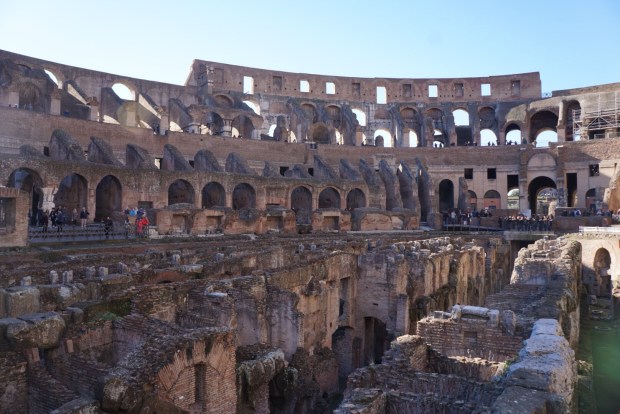 It was time for our tour and we hurried off. Our tour guide was an animated young man, and more often than not we were grateful for the hand gestures to help us understand what he was saying. I mean, I can get myself through a train station and even a hospital in Spanish, but understanding a tour about the construction of Ancient Rome is another thing. The Hypogeum, or basement, was really interesting – the old stones and a reconstructed wooden contraption to show how animals and props were brought out onto the stage from below, a water gutter as well for drainage. Fun fact: before the basement was constructed, the floor of the Colosseum was solid enough that they would fill it with water for aquatic competitions! Boats would be floated in and grand maritime battles were staged, all in the space of the arena. Much of the Colosseum was made out of valuable marble and travertine, all of which were stripped away for use in other buildings when the arena fell into disuse, leaving only the stone foundations.