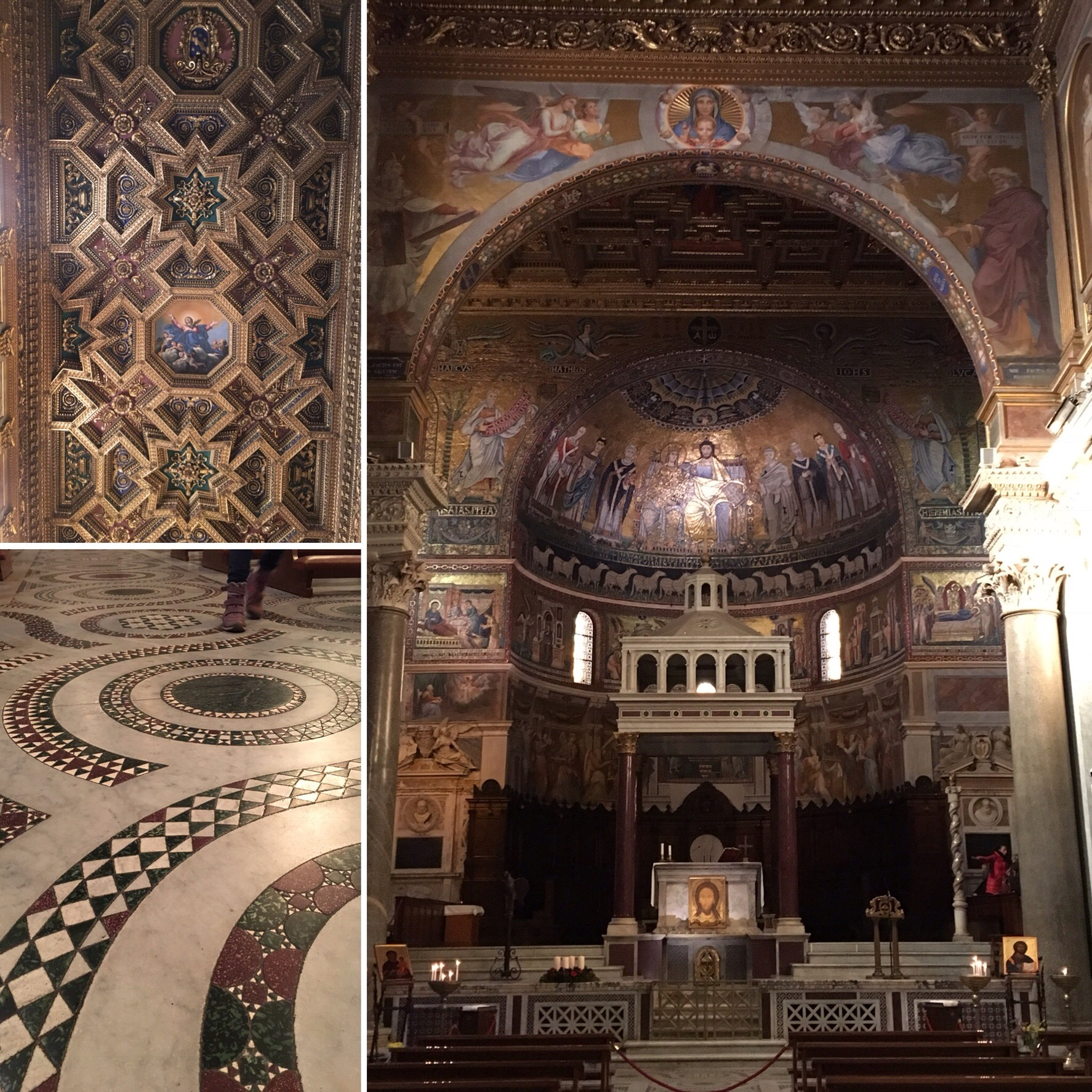 The next day was planned by the boy. I’ve found that the kids do well with travel planning but need a real map and book to do so, which were kindly lent to us by our friend Rob. The plan was to walk south to see the old city wall, and then follow it westward to the Vatican to see St. Peter’s cathedral and the Sistine chapel. We committed to not using our phones to navigate, only maps and street signs. We quickly learned that the signs in Rome may leave out some critical turns, and we got a bit lost! We started just asking people ways to known landmarks. Our first stop was the Campo de Fiori, a former flower field now the site of a bustling market. We arrived with anticipation, perhaps we would pick up some fruit and cheese for a snack, and found the plaza entirely deserted. The boy asked a local vendor, “Scuza, where is the market?”and we learned that on Tuesdays, the market is closed. Ah. We found the church of Santa Maria and popped i to enjoy the detailed stone flooring and gilt ceiling work.